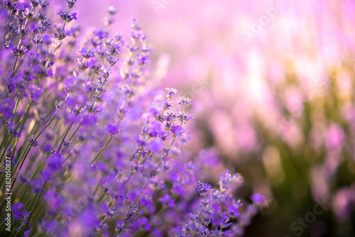 Naklejka premium Intense purple lavender field оverwhelmed with blooming bushes grown for...