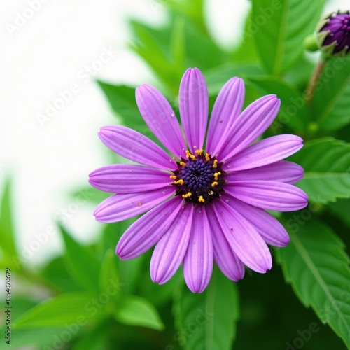 Fototapeta premium Intense purple wildflower, lush green leaves, crisp white backdrop ,...