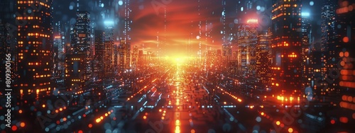 Fototapeta premium Intense red and blue neon lights depict the rapid pace of life in a digitally...