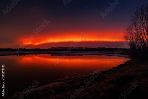Fototapeta premium Intense Red and Orange Sunset Reflection Over Dark Water with Dramatic...