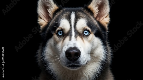 Obraz premium Intense Siberian Husky Portrait with Piercing Blue Eyes on Black Background