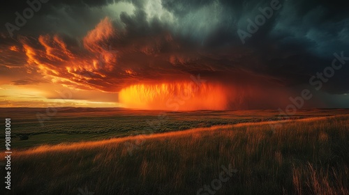 Obraz premium Intense Sunset Storm Over Grasslands - Fiery sunset storm with dramatic...