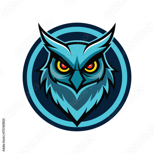© Mother Of Mahofuj, Fototapeta premium Intense teal and blue owl mascot with fiery orange eyes in a circular emblem