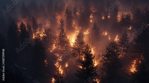 © -Quantum Pixels-, Naklejka premium Intense wildfire engulfing a dense forest at night, with flames devouring pine trees and thick smoke rising, highlighting the destruction caused by extreme heat and dry conditions.
