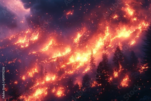 © Yana, Fototapeta premium Intense Wildfire Engulfs Forest Hills at Night, Creating a Fiery Inferno with a Smoky, Dramatic Sky