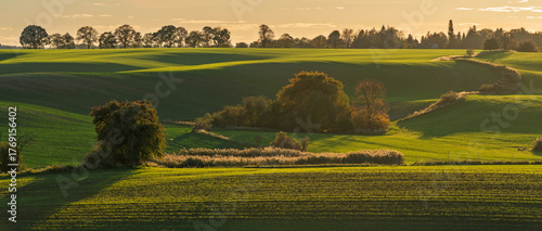 Fototapeta premium Intensely green fields contrasting with the autumn colors of trees in...
