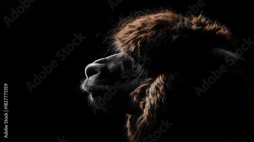 Fototapeta premium Intensely lit Alpaca face in dark mountain backdrop