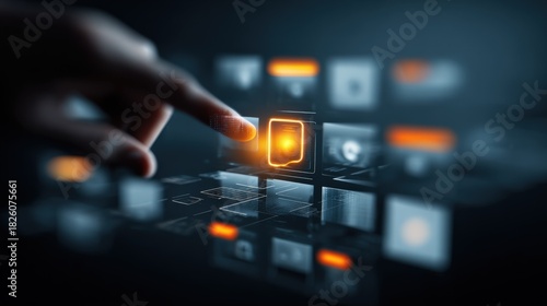 © The Little Hut, Obraz premium Interactive Touchscreen Interface: Finger Activating Digital Icon for Data Management and Modern Technology