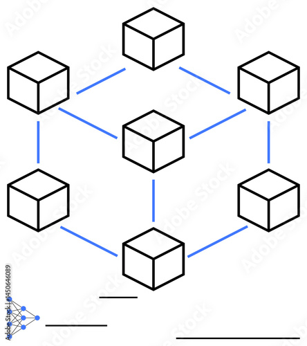 © robu_s, Obraz premium Interconnected cubes linked with blue lines visualizing a blockchain network structure. Ideal for technology, decentralization, data security, digital innovation, internet, peer-to-peer, flat simple