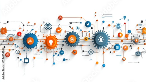 © Wiryo, Obraz premium Interconnected gears and icons representing a complex system, network, or process.