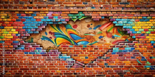 Fototapeta premium Interesting gap in a brick wall covered with vibrant graffiti , urban, street art, graffiti, brick wall, unique