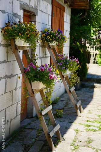 © Svitlana Kolycheva, Naklejka premium Interesting idea for container vertical garden flowering plants.