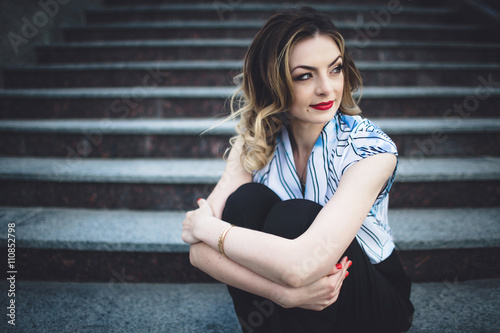 © andriychuk, Fototapeta premium interesting young lady sitting on stairs