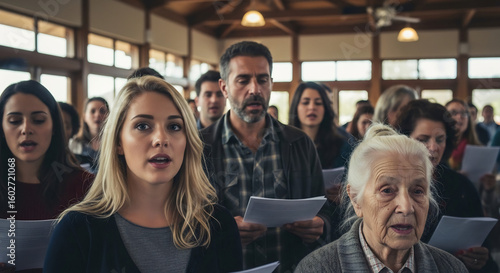 © hwsky, Naklejka premium Intergenerational community singing with heartfelt emotion, holding sheet music. Group expressing solemn unity, peace, and shared reflection in gathering.