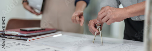 © mojo_cp, Obraz premium Interior architect working with blueprint planning in modern office, engineering concept. .