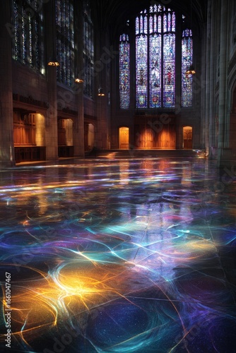 Obraz premium Interior church floor with stained-glass window reflection