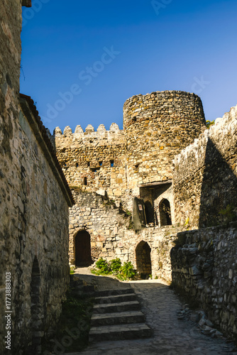 © Anna, Fototapeta premium Interior courtyard of Ananuri fortress with medieval stone walls, arched doors and a round defensive tower under clear blue sky