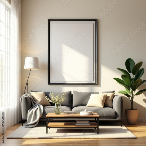 © Reazy Studio, Obraz premium Interior design living room mockup blank frame sofa plant modern home decor template background render
