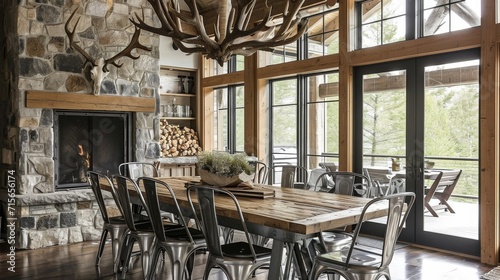 Naklejka premium Interior Design Mockup: A rustic dining area with a reclaimed wood table, industrial metal chairs, an antler chandelier, and a stone fireplace