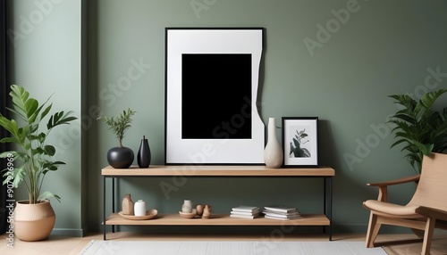 © LetsRock, Obraz premium Interior design of a modern living room with a white wall and home decor pieces, featuring an empty mock-up black poster frame on a wooden shelf