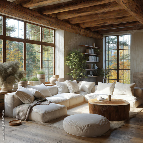 Fototapeta premium Interior design of modern apartment with fabric sofa, table with home decor, green plants. Interior mockup. Generative AI