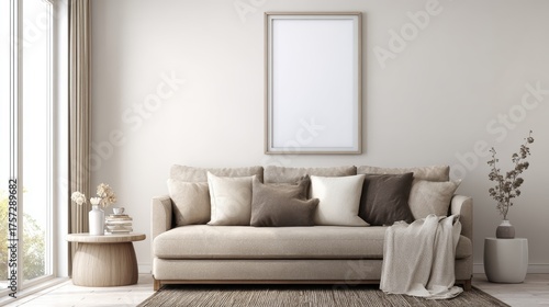 Fototapeta premium interior design of modern living room with beige fabric sofa and cushions. White wall with frame and space for text, living, furniture