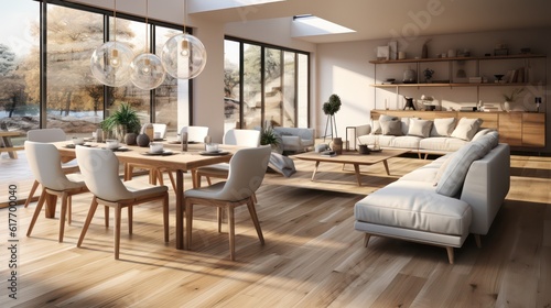 Fototapeta premium Interior design of modern scandinavian apartment, living room and dining room. Created with generative AI.