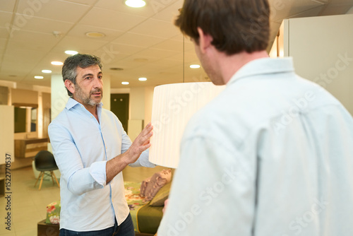 © alvaro, Fototapeta premium Interior designer showing lamp to client in furniture showroom