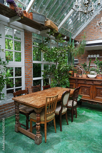 © chettarin, Naklejka premium Interior dining design and decoration of coffee cafe, bakery shop and fusion restaurant decorated with wooden furniture, flower plants and sculpture