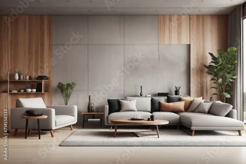 © Basileus, Fototapeta premium Interior home design of modern living room with gray sofa and tv against wooden wall