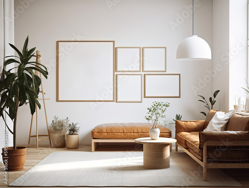 © FloxyArt, Fototapeta premium Interior living room wall mockup with sofa and light grey, brown and wood decor on white background.