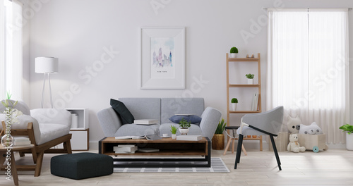 © pramote, Fototapeta premium Interior mock up living room with armchair ,TV on cabinet in modern living room with lamp,table,flower and plant on wooden wall background,3d rendering
