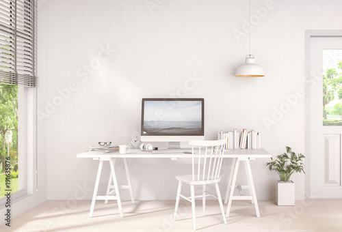 © srijaroen, Fototapeta premium interior modern living room workspace with desk and laptop computer and green landscape in window. 3D rendering