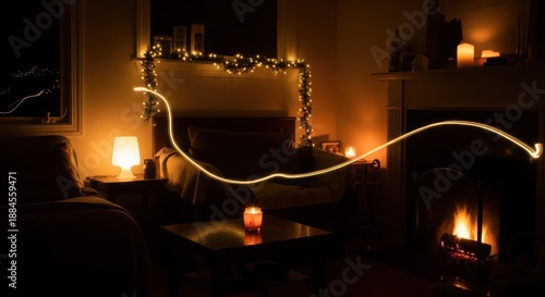Fototapeta premium Interior nighttime scene illuminated by various warm lights and an abstract light trail across the room.