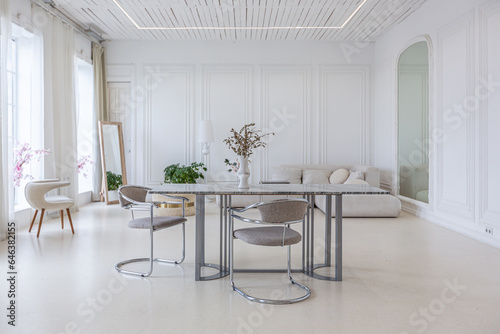 © 4595886, Fototapeta premium interior of a bright living room in a luxurious baroque style with white walls decorated with antique stucco