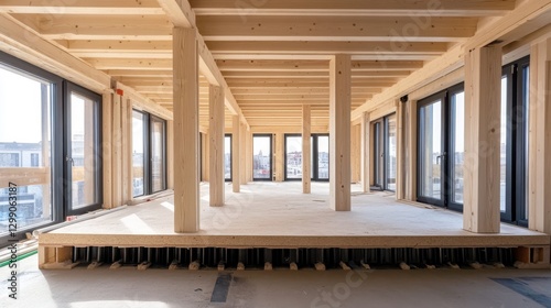 © Professional Agency, Obraz premium Interior of a building under construction showing wooden beams and concrete floor