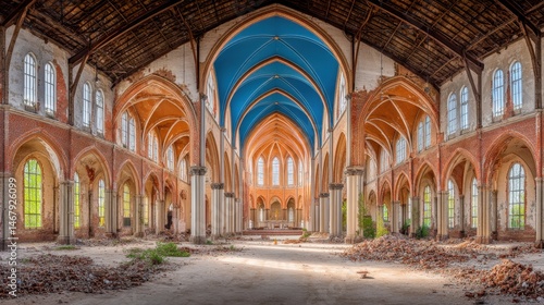 Fototapeta premium Interior of a dilapidated brick church with vaulted blue ceiling and ruined...