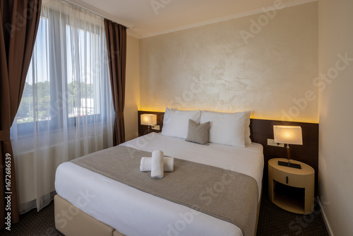 © rilueda, Fototapeta premium Interior of a hotel room with a large comfortable bed
