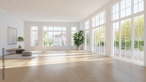 Obraz premium Interior of a maisonette with high ceilings and large windows, soft light,...