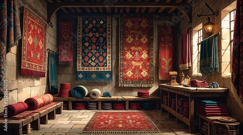 Obraz premium Interior of a Medieval Carpet Shop with Wool Rugs