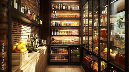 Naklejka premium Interior of a modern bar with shelves of liquor bottles and jars.
