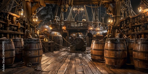 Fototapeta premium Interior of a pirate ship deck with barrels, cannons, and lanterns, depicting...