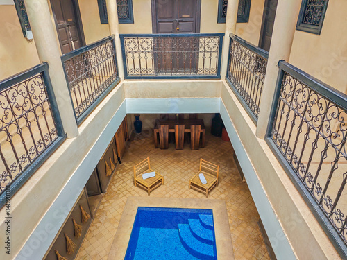 © Audrius, Obraz premium Interior of a typical Moroccan riad with a small pool in the middle of the building. Accommodation in traditional Moroccan hotel in Medina