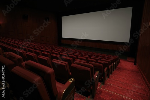 © Cyber Shutter, Fototapeta premium Interior of a vacant theater with red seats and a white projection screen, viewed from the side