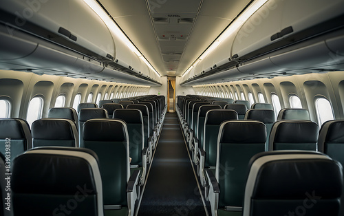 © Creative Laik, Fototapeta premium Interior of airplane with blue seats and white ceiling in blue tones
