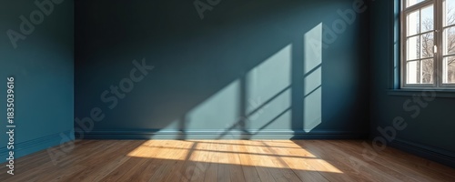 Obraz premium Interior of an empty room with dark teal walls and wooden floors. Sunlight streams through the window casting geometric shadows on the wall and floor, creating a tranquil atmosphere.
