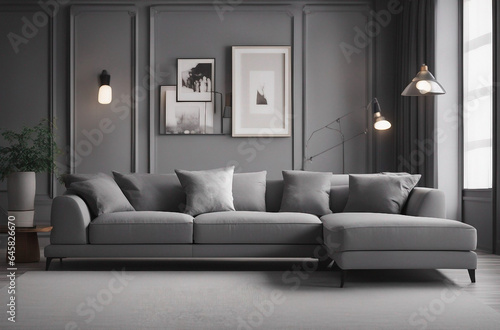 Fototapeta premium Interior of beautiful gray modern living room with comfortable sofa