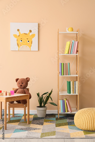 Obraz premium Interior of children's room with bookshelf, table and toys