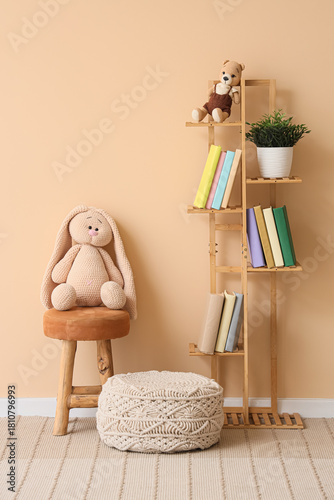 Naklejka premium Interior of children's room with bookshelf, toys and poufs