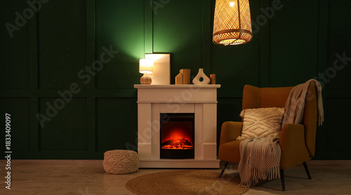 Fototapeta premium Interior of dark living room with fireplace, armchair and glowing lamps at night